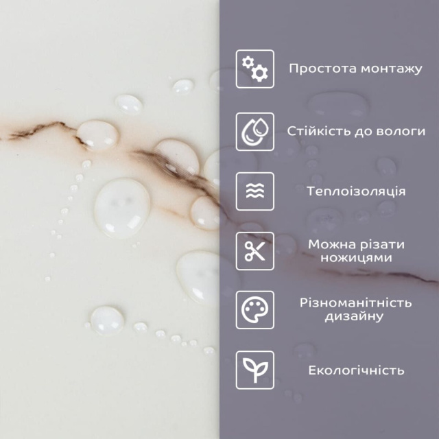 • 2. Стійкість до вологи: матеріал стійкий до впливу вологи та пари, а також до появи плісняви, що робить його придатним для використання у приміщеннях з високою вологістю, таких як ванни та кухні. Плитка підходить для створення фартуха кухні, можна клеїти біля плити на відстані не менше ніж 20-25 см;