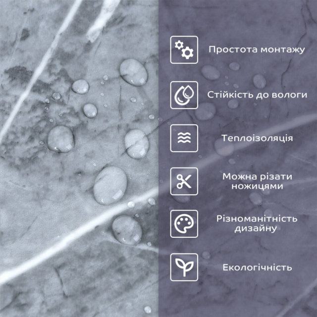 • 2. Стійкість до вологи: матеріал стійкий до впливу вологи та пари, а також до появи плісняви, що робить його придатним для використання у приміщеннях з високою вологістю, таких як ванни та кухні. Плитка підходить для створення фартуха кухні, можна клеїти біля плити на відстані не менше ніж 20-25 см;