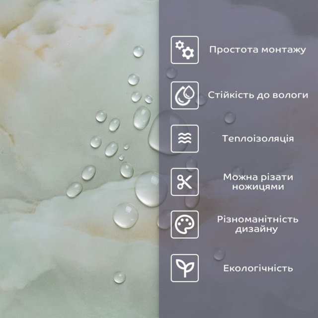 • 2. Стійкість до вологи: матеріал стійкий до впливу вологи та пари, а також до появи плісняви, що робить його придатним для використання у приміщеннях з високою вологістю, таких як ванни та кухні. Плитка підходить для створення фартуха кухні, можна клеїти біля плити на відстані не менше ніж 20-25 см;