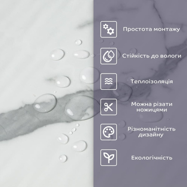 • 2. Стійкість до вологи: матеріал стійкий до впливу вологи та пари, а також до появи плісняви, що робить його придатним для використання у приміщеннях з високою вологістю, таких як ванни та кухні. Плитка підходить для створення фартуха кухні, можна клеїти біля плити на відстані не менше ніж 20-25 см;