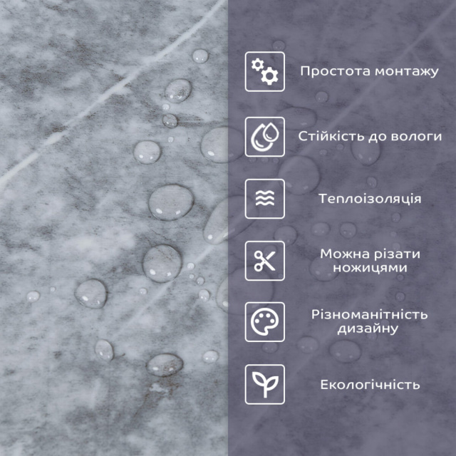 - 1. Легкість та міцність: плитка легка та міцна, що спрощує її логістику, установку та забезпечує довгий термін служби. Матеріал легкий в установці, можна різати ножицями чи монтажним ножем, не потребує додаткових матеріалів чи спеціалістів. Між смугами не розходиться, не роздмухується і не деформується. Відсоток обрізу становить 1%, що є найкращим показником для настінних покриттів;