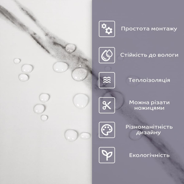 - 1. Легкість та міцність: плитка легка та міцна, що спрощує її логістику, установку та забезпечує довгий термін служби. Матеріал легкий в установці, можна різати ножицями чи монтажним ножем, не потребує додаткових матеріалів чи спеціалістів. Між смугами не розходиться, не роздмухується і не деформується. Відсоток обрізу становить 1%, що є найкращим показником для настінних покриттів;