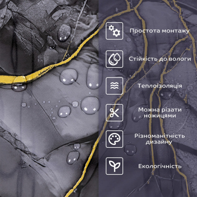 - 1. Легкість та міцність: плитка легка та міцна, що спрощує її логістику, установку та забезпечує довгий термін служби. Матеріал легкий в установці, можна різати ножицями чи монтажним ножем, не потребує додаткових матеріалів чи спеціалістів. Між смугами не розходиться, не роздмухується і не деформується. Відсоток обрізу становить 1%, що є найкращим показником для настінних покриттів;