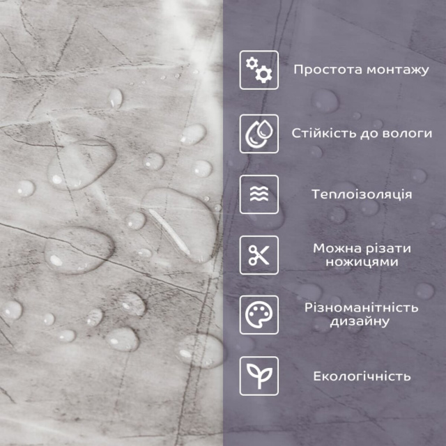 - 1. Легкість та міцність: плитка легка та міцна, що спрощує її логістику, установку та забезпечує довгий термін служби. Матеріал легкий в установці, можна різати ножицями чи монтажним ножем, не потребує додаткових матеріалів чи спеціалістів. Між смугами не розходиться, не роздмухується і не деформується. Відсоток обрізу становить 1%, що є найкращим показником для настінних покриттів;