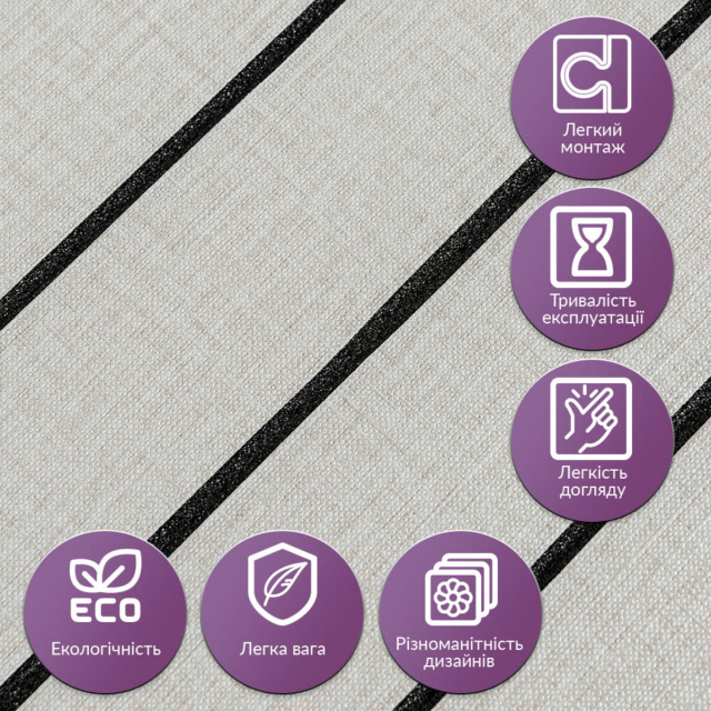 Легка установка: Завдяки клейовому шару монтаж вінілових рейок швидкий і простий, без потреби в додаткових матеріалах. Рейки легко ріжуться монтажним ножем або ножицями, укладаються стик у стик. Відсоток обрізу для настінних покриттів дуже низький.