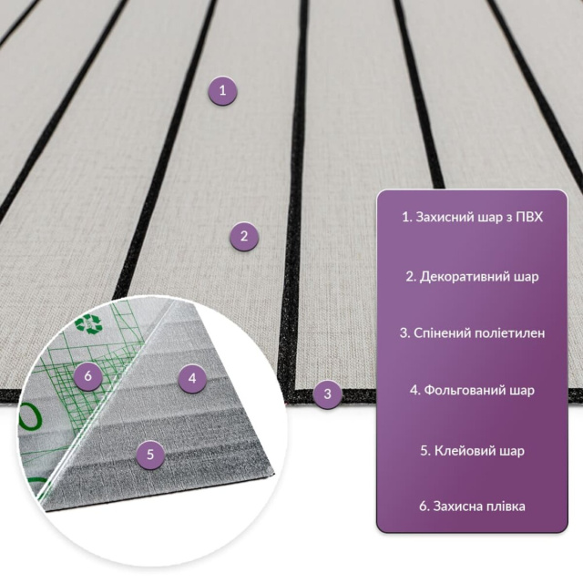 Декоративний шар: плівка з кольоровим друком високої роздільної якості, яка повністю імітує фактуру природних матеріалів завдяки чіткому та деталізованому зображенню.