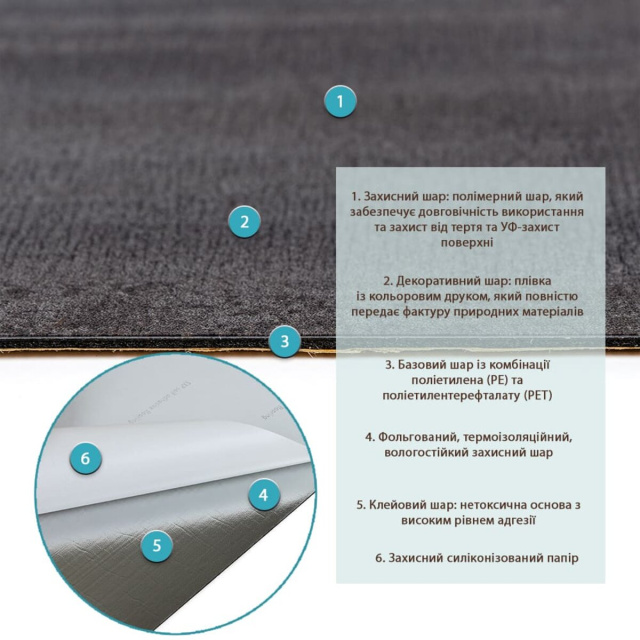 - Полімерний шар: захищає від потертостей та дрібних механічних пошкоджень, забезпечує довговічність використання, а УФ захист допомагає запобігти вигоранню, зберігаючи колір насиченим.