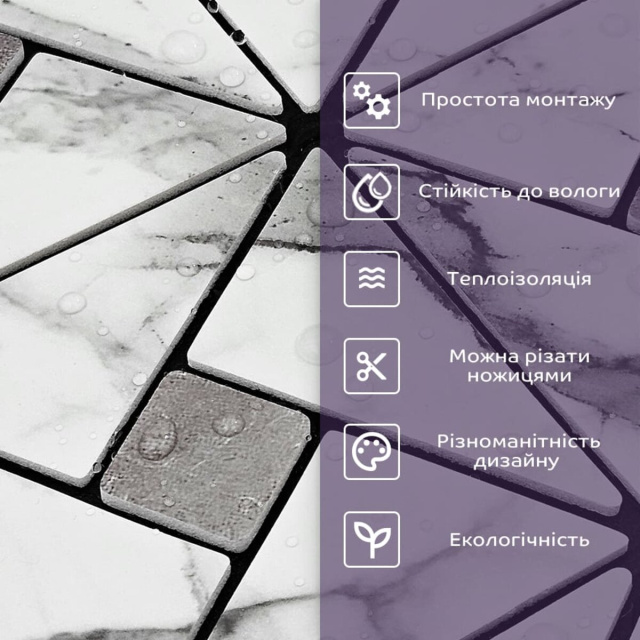 • Стійкість до вологи: матеріал стійкий до впливу вологи та пари, а також до появи плісняви, що робить його придатним для використання у приміщеннях з високою вологістю, таких як ванни та кухні. Плитка підходить для створення фартуха кухні, можна клеїти біля плити на відстані не менше ніж 20-25 см;