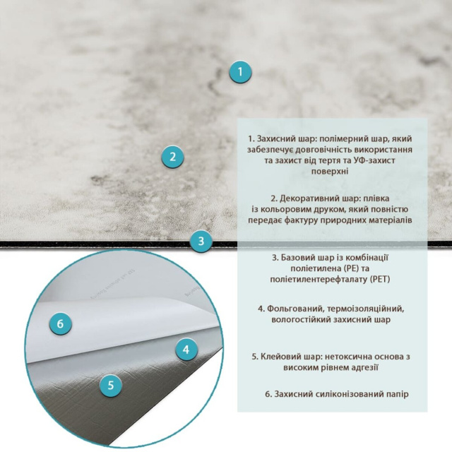 • Декоративний шар: плівка з кольоровим друком високої якості, яка повністю імітує фактуру природних матеріалів завдяки чіткому та деталізованому зображенню.